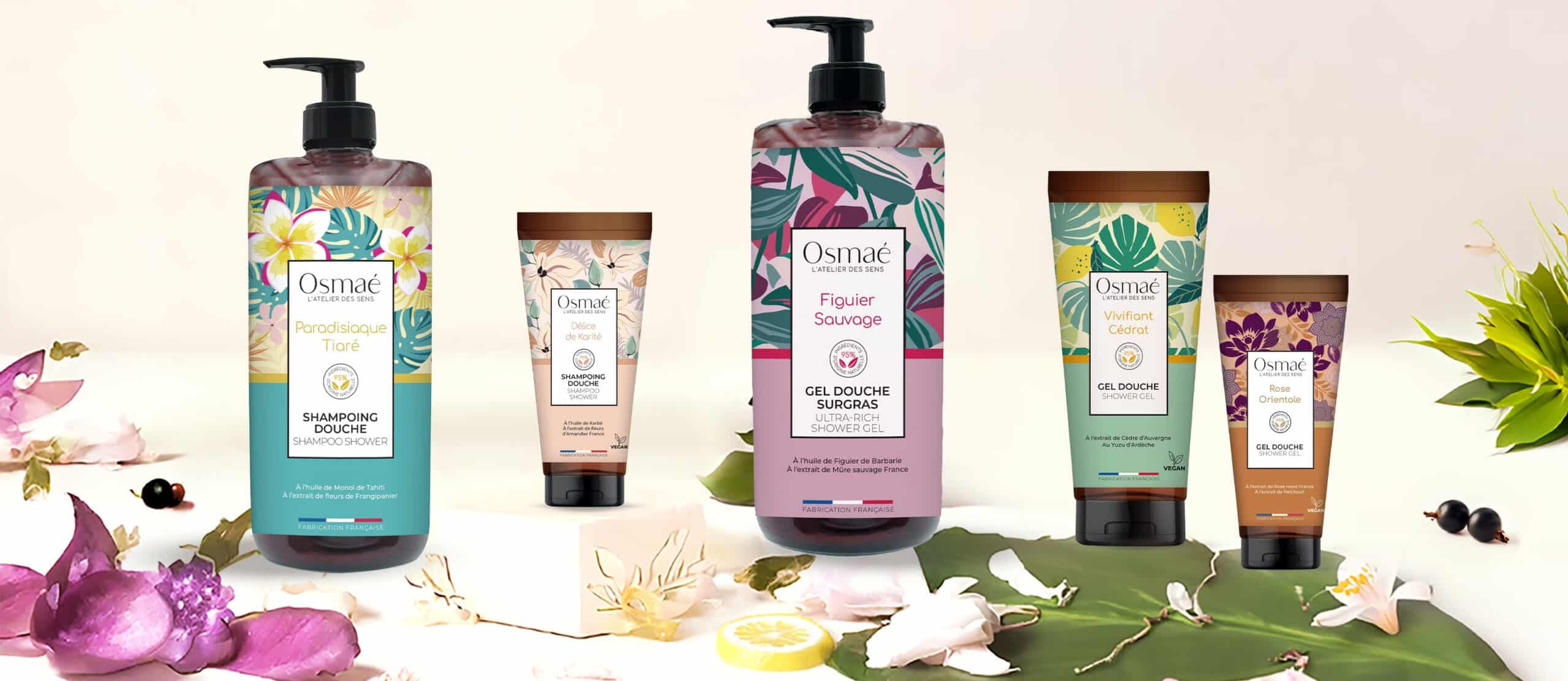 Zintuiglijke douchegels en shampoo douche van Osmaé… ontworpen als een parfum, zacht voor huid en haar.