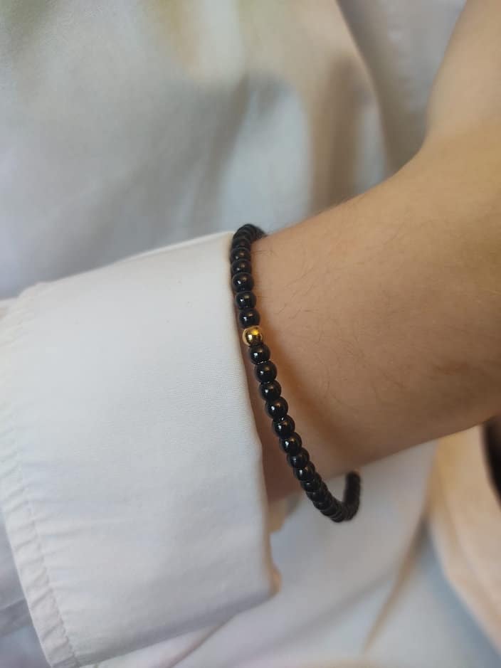 De 3Bello Wave Line armband is een toonbeeld van Belgisch vakmanschap waar minimalisme en elegantie samenkomen. Deze handgemaakte armband combineert zwarte kralen (4mm) van elektrolytisch gekleurd roestvrij staal met twee opvallende gouden accenten, wat resulteert in een tijdloos design voor zowel hem als haar.